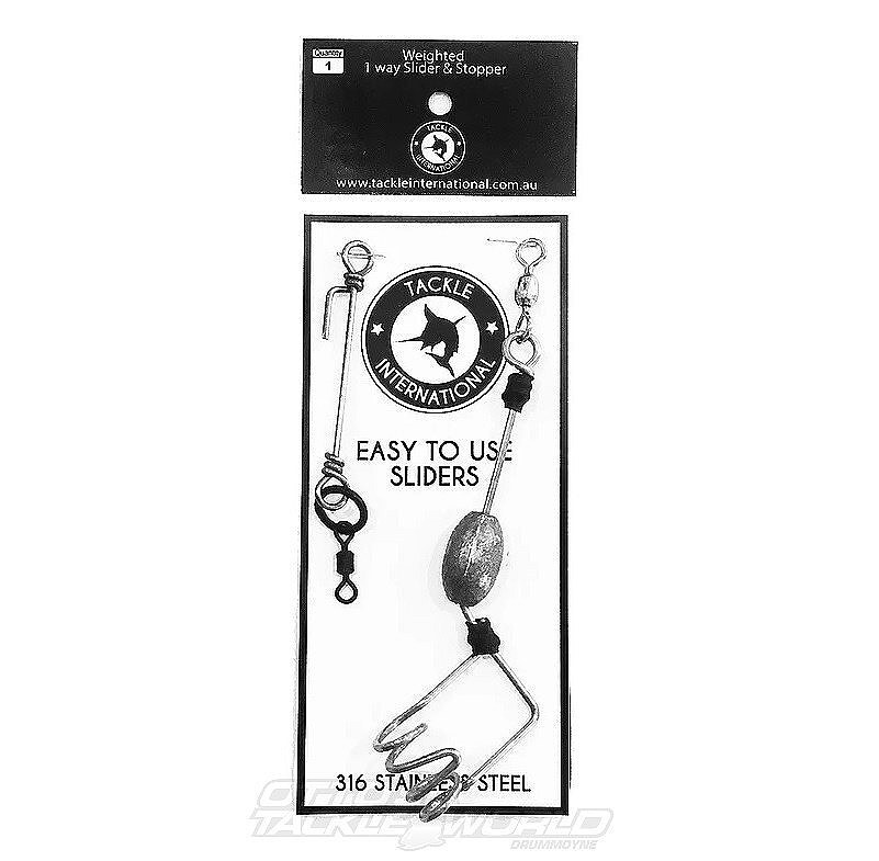 Easy to use sliders For all the slide bait enthusiasts, this is Tackle International's original one way weighted slider. If you slide bait off a wharf, beach, cliff or into a river; using live or dead baits these sliders are for you. Weighted sliders are perfectly suited for waterways that do not have much current or for days when you are fishing with really small live baits or even dead baits. How it works: Cast the grapnel slider as far as you can, lock it into the seabed, pin your bait to the hook, attach the slider to the mainline and let it slide into the strike zone. The sliders are easy to attach. Once you hook up to a fish the sliders will not get detached from your mainline and you'll end the fight on the 300 lb slide stopper. These sliders are handmade from 500 lb Japanese marine grade stainless steel, 30g lead bean sinker and 100kg tested swivel. The slide stoppers are handmade from 300 lb Japanese marine grade stainless steel, a 200 lb tested solid ring and a 50 lb tested swivel. Quantity per pack: 1 Frequently Asked Questions 1. Braid, monofilament or a combination of both? Yes, Yes and yes. Using braid alone will give you a great cast the downside to braid is that if your bait gets hit by a good fish before the slider runs down to the shock leader, wind on or slide stopper you risk getting burnt off. Using a strong monofilament line with a thin diameter is optimum for slide bait fishing, monofilament has better abrasion resistance and also the sliders run down them more efficiently. A combination of braid with a top shot of monofilament is optimum and if you are serious about catching big fish this is the way to go. Give yourself about 120-150m of monofilament on top and the rest of your spool filled with braid. If your bait gets hit by good fish, you have your monofilament on top and a few hundred meters of braid underneath to fight the fish. 2. Can slide bait fishing be used off the beach? Yes you can slide bait from anywhere beach, wharf, rocks, cliff, lake, river and even from boats. 3. Can I use a star sinker or a snapper lead to hold bottom? Yes in very calm conditions or in an area that has no current, no in most conditions. For the best results use grapnel sinkers which come in many different weights. Before choosing your sinker size check your rods maximum casting weight and stay under or equal to that. Using the grapnel will hold bottom better, allowing you to keep the line tight, this is an absolute must when using 1 way (non return) sliders. 4. Can "J" hooks be used? Yes "J" hooks can be used, but the best hooks to use when slide bait fishing are circle hooks either inline or offset. Reason for this is most slide bait fisho's deploy their baits, then leave their rod in the rod holder, when a fish hits the bait and the sinker is dislodged this action sets the hook. For those fisho's who hold the rod in their hands, "J" hooks or circles will work. Ultimately this is up to you but I think I've seen 2 fish lost by slide baiters due to hooks in the last 6 or so years. 5. How long does my hook leader need to be? 30cm no more when it comes to hook leader, in rough conditions this can be even shorter. In saying this I have seen hook leaders up to 2m being used successfully, I'll leave this for you to test. 6. Weighted or unweighted sliders? Seriously there is no right or wrong answer here, I used unweighted for many years and just recently started using weighted. The way I see it is if I'm using a live bait either will work, if I'm using a dead bait in an area without much current weighted may work better. 7. What rod should I use? The rod that will allow you to cast the heaviest grapnel sinker the furthest possible distance and finally you need the strongest rod to fight the biggest fish you are going to catch in the area you fish. Some of the best rod manufacturers on the market at the moment are Excalibur Tackle Australia and Assassin Tackle. 8. What strength hook leader? This depends on what you are targeting but generally 30lb to 150lb fluro carbon.