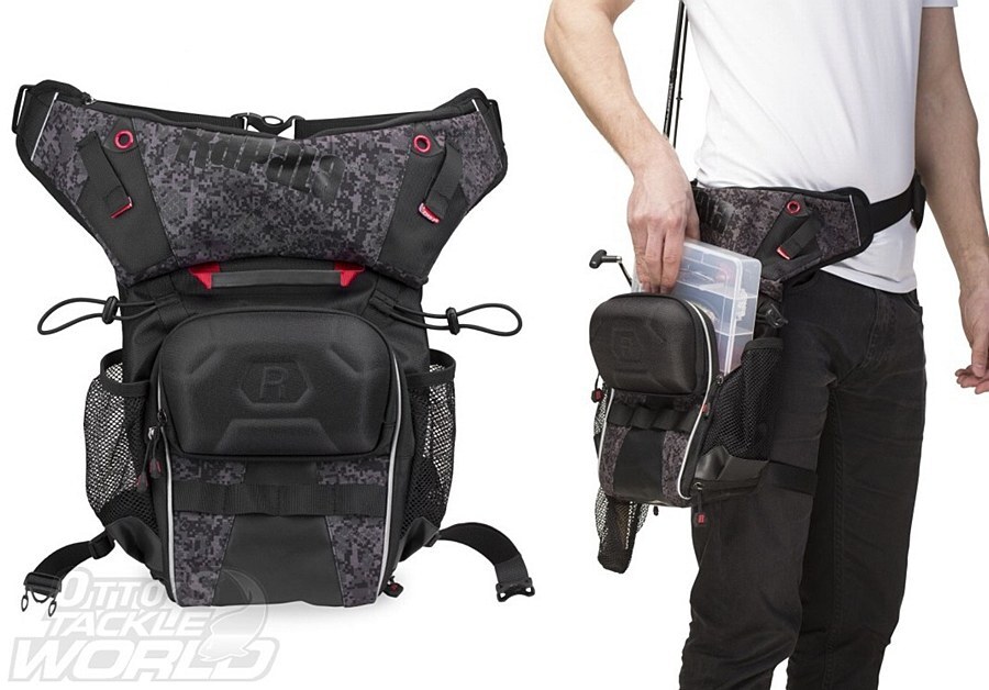 The new Rapala Urban Series is a full range of technical, fishing specific bags designed for urban street fishing. Sleek designs feature multiple tackle storage options for the mobile angler. The Urban Hip Pack is an innovative compact tackle organizer that’s designed to be worn on the hip. It features a main compartment for 3500-sized tackle boxes, quick draw plier holsters, molded EVA hard case pocket for sunglasses and a rod holder system on both sides. Compatible for left and right hand use. Features