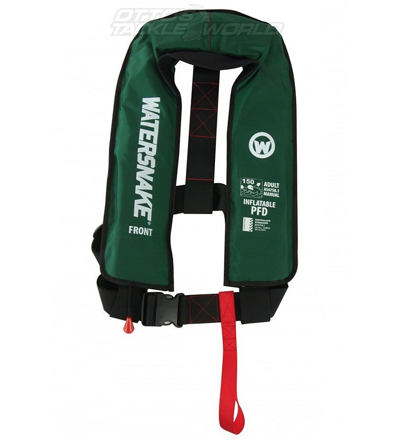 The lightweight Watersnake Inflatable PFD Level 150 yoke has been designed to meet the latest AS4758.1 stringent safety rating. The Watersnake Inflatable PFD Level 150 Foul Weather Offshore Yoke is designed for all-day comfort, with a soft neoprene neck-liner to avoid irritation or chaffing on the back of your neck. It is designed to wear over your clothes and has a large 50mm webbing belt with a twin-tab synthetic nylon buckle for quick and easy fitting. The tough and durable material is nylon Oxford 420D with convenient access for maintenance and servicing. It is rated for adults heavier than 40kg+, with chest sizes 80cm to 140cm. This Watersnake Inflatable PFD is designed flat for easy storage and has a manual inflation system that is easily activated by pulling down on the toggle to initiate the release of the 33g CO2 gas cylinder. There is also a mouthpiece for oral inflation. Watersnake Level 150 lifejackets are designed for general offshore and rough weather use, where a high standard of safety and performance is required. They are designed to maintain a fully clothed person in a safe position on their back with their head clear of the water without any action required by the user. To view the other colours in this range, please click on the links below.