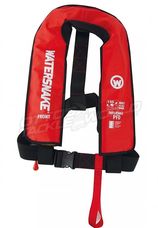 The lightweight Watersnake Inflatable PFD Level 150 yoke has been designed to meet the latest AS4758.1 stringent safety rating. The Watersnake Inflatable PFD Level 150 Foul Weather Offshore Yoke is designed for all-day comfort, with a soft neoprene neck-liner to avoid irritation or chaffing on the back of your neck. It is designed to wear over your clothes and has a large 50mm webbing belt with a twin-tab synthetic nylon buckle for quick and easy fitting. The tough and durable material is nylon Oxford 420D with convenient access for maintenance and servicing. It is rated for adults heavier than 40kg+, with chest sizes 80cm to 140cm. This Watersnake Inflatable PFD is designed flat for easy storage and has a manual inflation system that is easily activated by pulling down on the toggle to initiate the release of the 33g CO2 gas cylinder. There is also a mouthpiece for oral inflation. Watersnake Level 150 lifejackets are designed for general offshore and rough weather use, where a high standard of safety and performance is required. They are designed to maintain a fully clothed person in a safe position on their back with their head clear of the water without any action required by the user. To view the other colours in this range, please click on the links below.